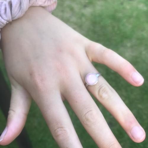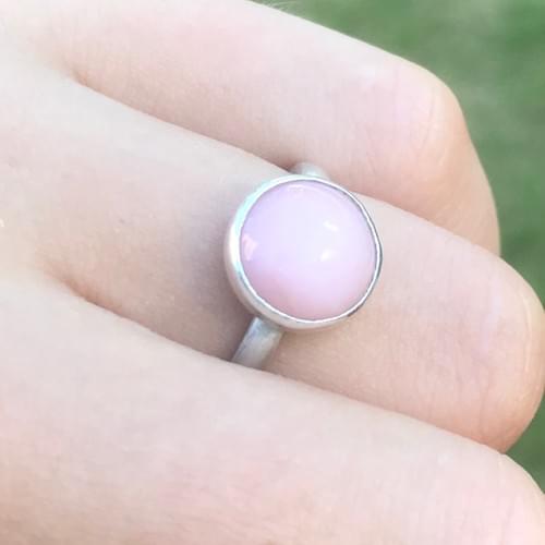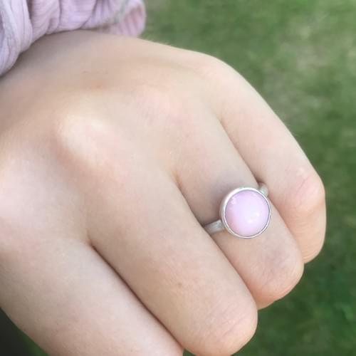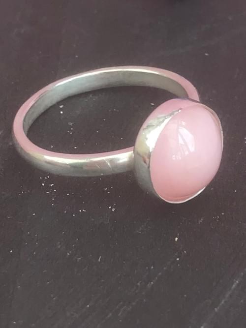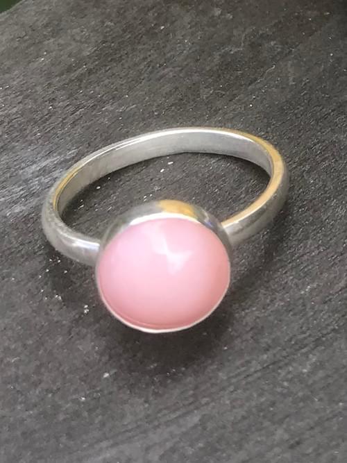 £60.00A real statement ring, this exquisite ring is handmade from a half round (D-shaped) sterling silver wire and set with a beautiful 10mm round pink opal cabochon gemstone.